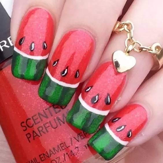 3. 在指甲上绘制吃瓜酱图案,可以使用美甲颜料或者直接用吃瓜酱。